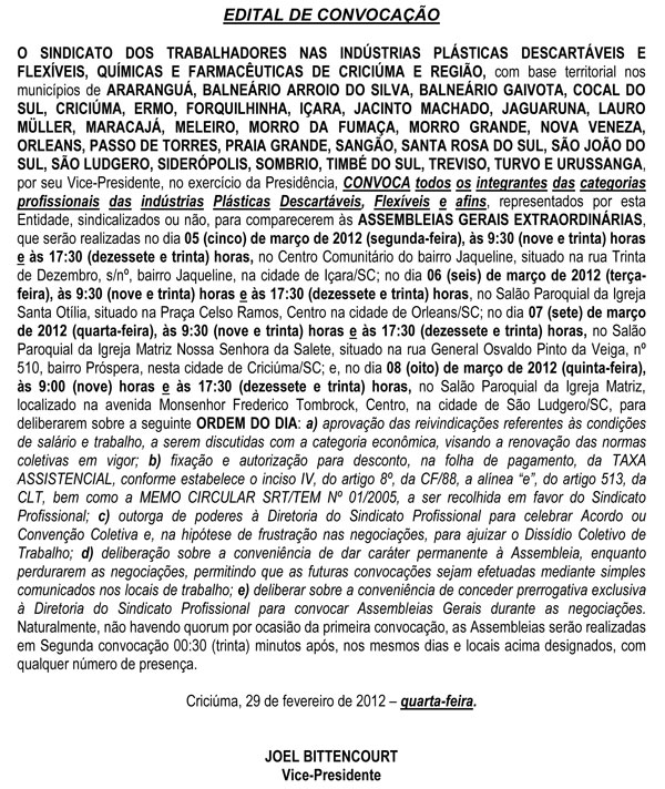 Edital de Convocação da Categoria Plástica para discussão do Rol de Reivindicação. Data base abril 2012