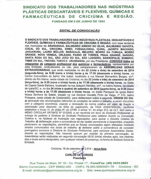 Edital de Convocação da Categoria Química e Farmacêutica para discussão do Rol de Reivindicação. Data base Novembro 2014.