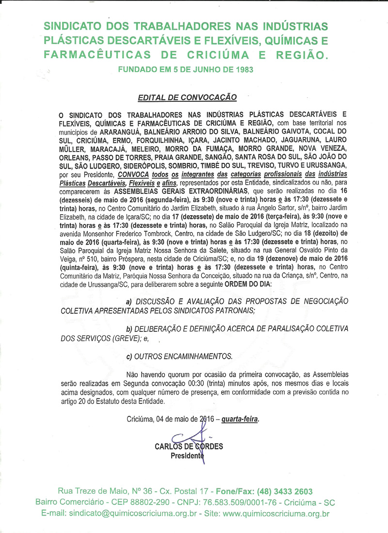 Edital de Convocação da Categoria Plástica para discussão da Proposta Patronal. Data base abril 2016