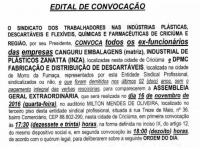 O Sindicato dos Químicos convoca todos os ex-funcionários das empresas CANGURU EMBALAGENS (matriz), INDUSTRIAL DE PLÁSTICOS ZANATTA (INZA) e DPMC FABRICAÇÃO E DISTRIBUIÇÃO DE DESCARTÁVEIS para comparecerem à ASSEMBLÉIA GERAL EXTRAORDINÁRIA.