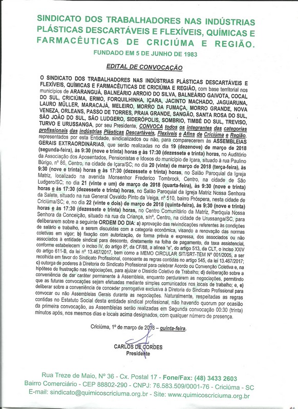 Edital de Convocação da Categoria Plástica para discussão do Rol de Reivindicação Data Base Abril/2018