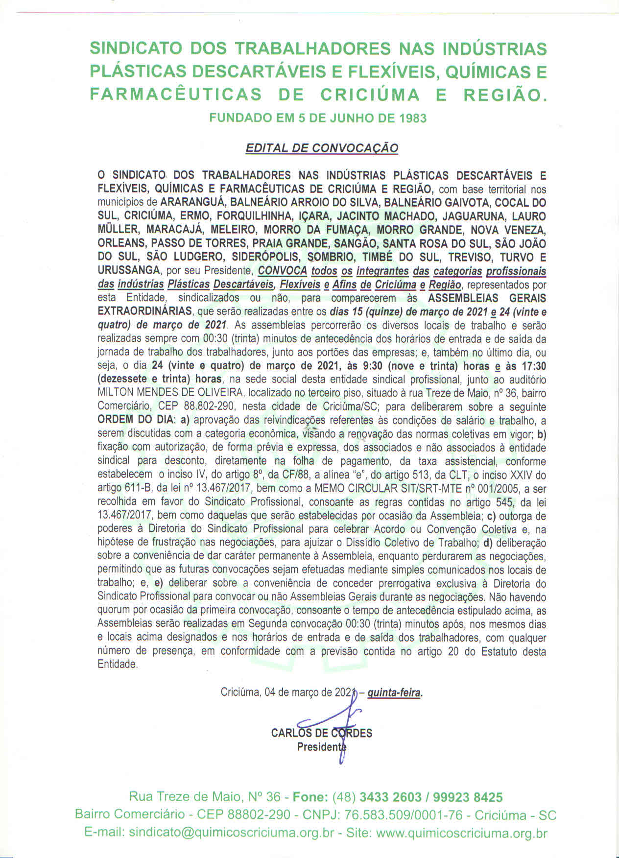 Edital de Convocação da Categoria Plástica para discussão do Rol de Reivindicação Data Base Abril/2021