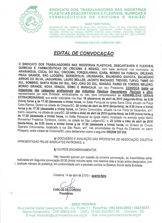 Edital de Convocação das Categorias Plásticas, Descartáveis, Flexíveis e afins, para discussão de Avaliação das Propostas de Negociação Coletiva