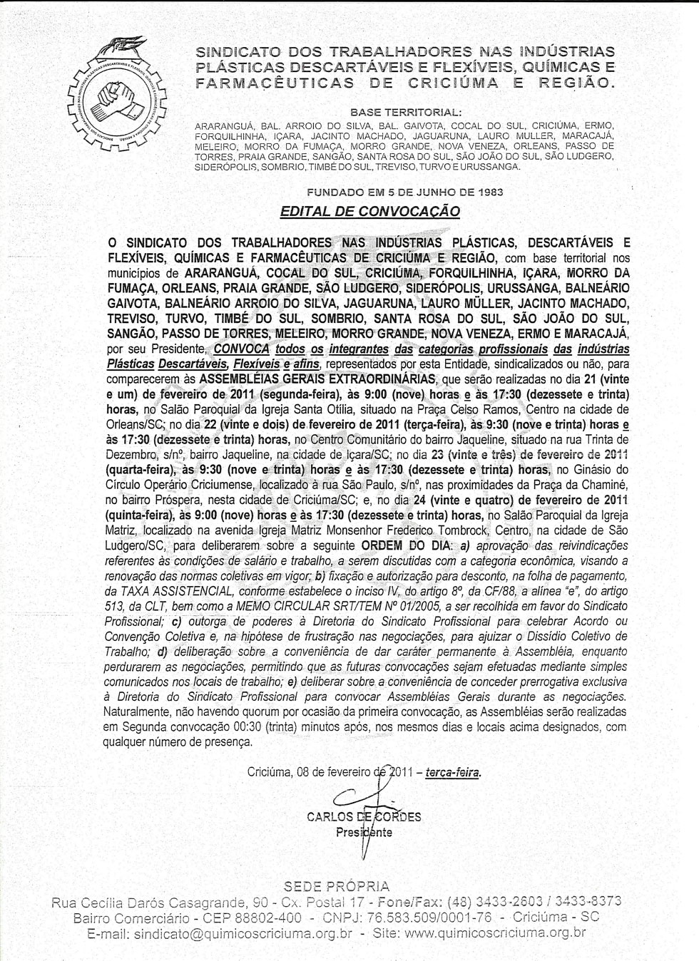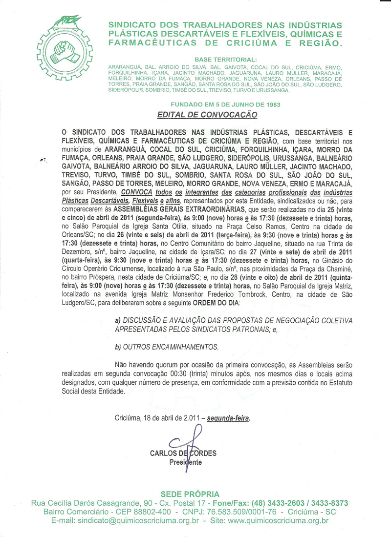 Edital de convocação da Categoria plastica para discussão de negociação coletiva. Data base Abril 2011